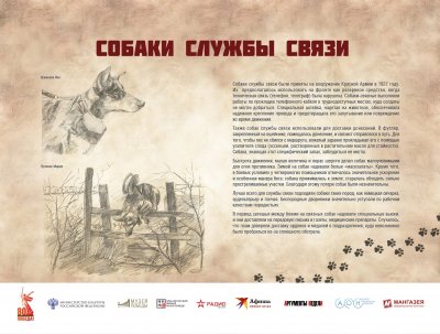 Выставка рассказывает братьях наших меньших – собаках, которые внесли большой вклад в общенародное дело Победы над нацистской Германией. Более 60 000 мохнатых героев прошли боевой путь от Москвы до Берлина. Во время войны части и подразделения Красной Армии впервые в военной истории массово, разнообразно и эффективно применяли служебных собак. В центральной школе военного собаководства животных готовили по 11 видам служб – связи, розыскной, караульной, сторожевой, противотанковой, санитарной, диверсионной, для химической разведки, авиасигнальной, ездовой и минно-розыскной.
