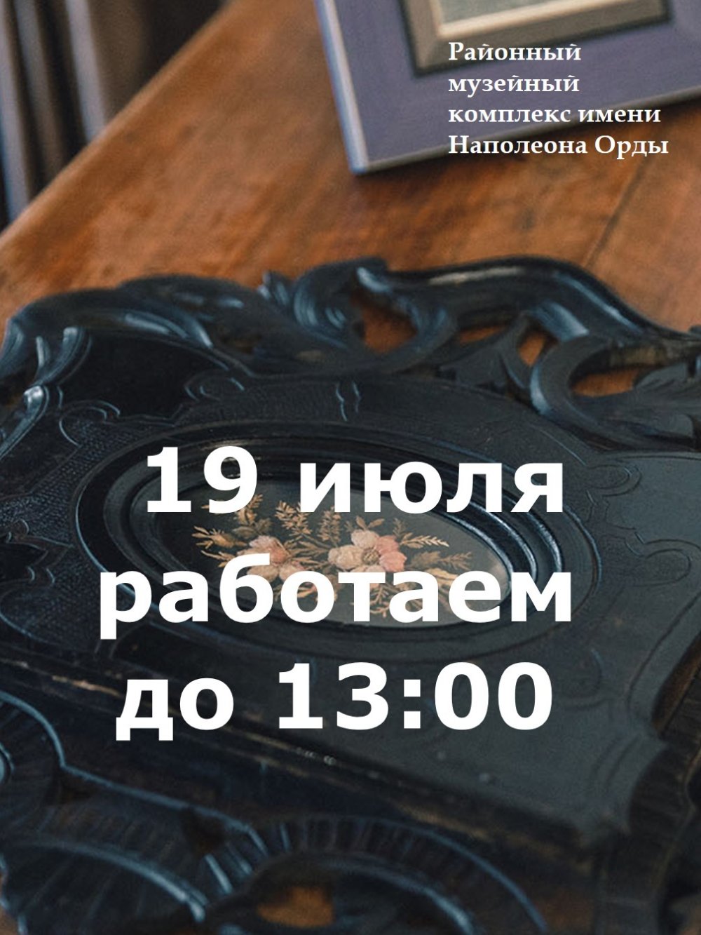 19 июля Районный музейный комплекс имени Наполеона Орды и его филиал«Усадебный дом Наполеона Орды» будет открыт до 13:00 в связи с участием в праздновании дня города.